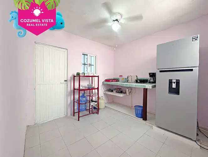 Cozy furnished apartment located on the first floor in the Independencia neighborhood of Cozumel, on Calle 23 Sur near 30 Av. The property features 1 bedroom, 1 full bathroom, a kitchen area, and a comfortable living room space.